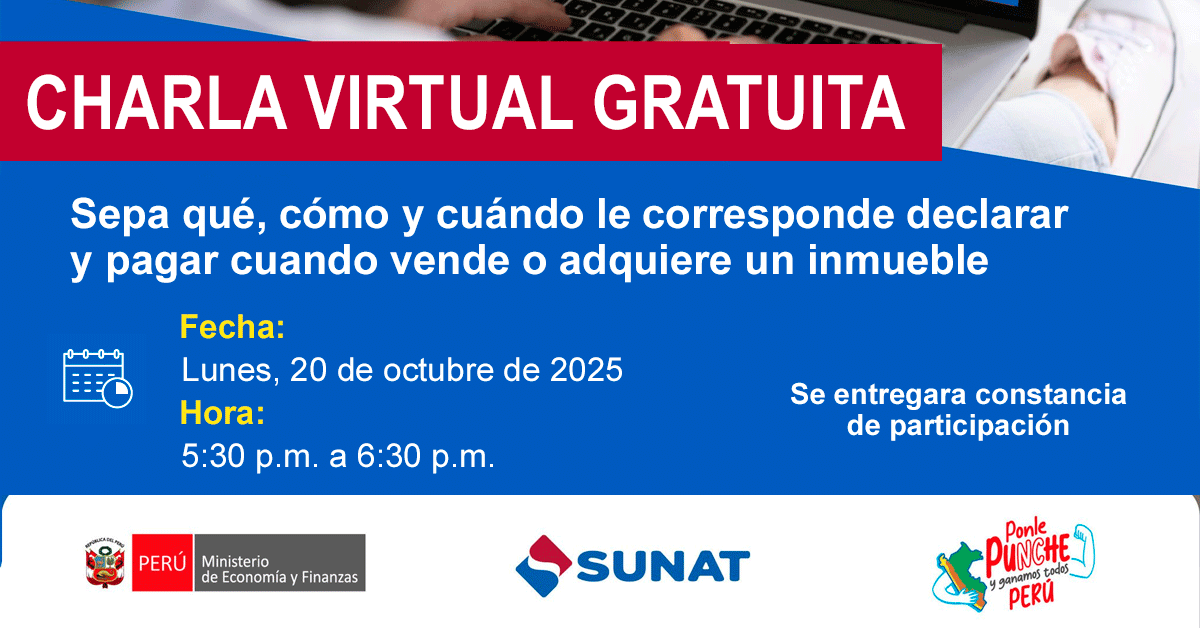 Charla virtual gratuita "Sepa qué, cómo y cuándo le corresponde declarar y pagar cuando vende o adquiere un inmueble" de la SUNAT