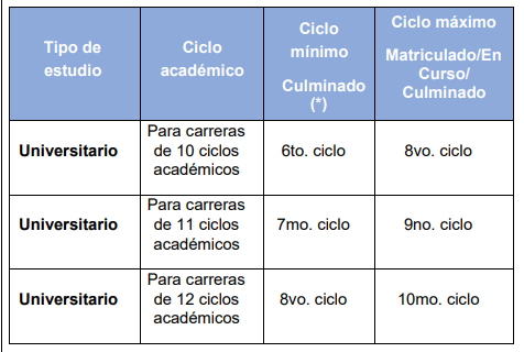 Formación Académica: Estudiante Universitario de las especialidades de diez (10) ciclos, once (11) ciclos o doce (12) ciclos, descritos según lo siguiente: